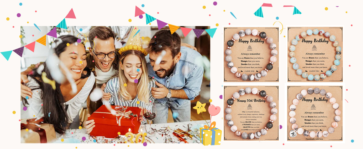 Regalos de cumpleaños de Fmeida para mujeres: pulseras elásticas de piedra natural para aniversarios de jubilación de 30, 35, 40, 45, 50, 60, 65, 70 y 80 años