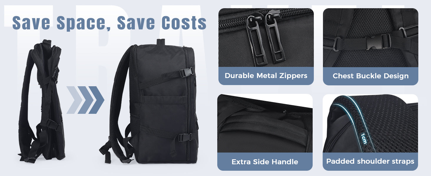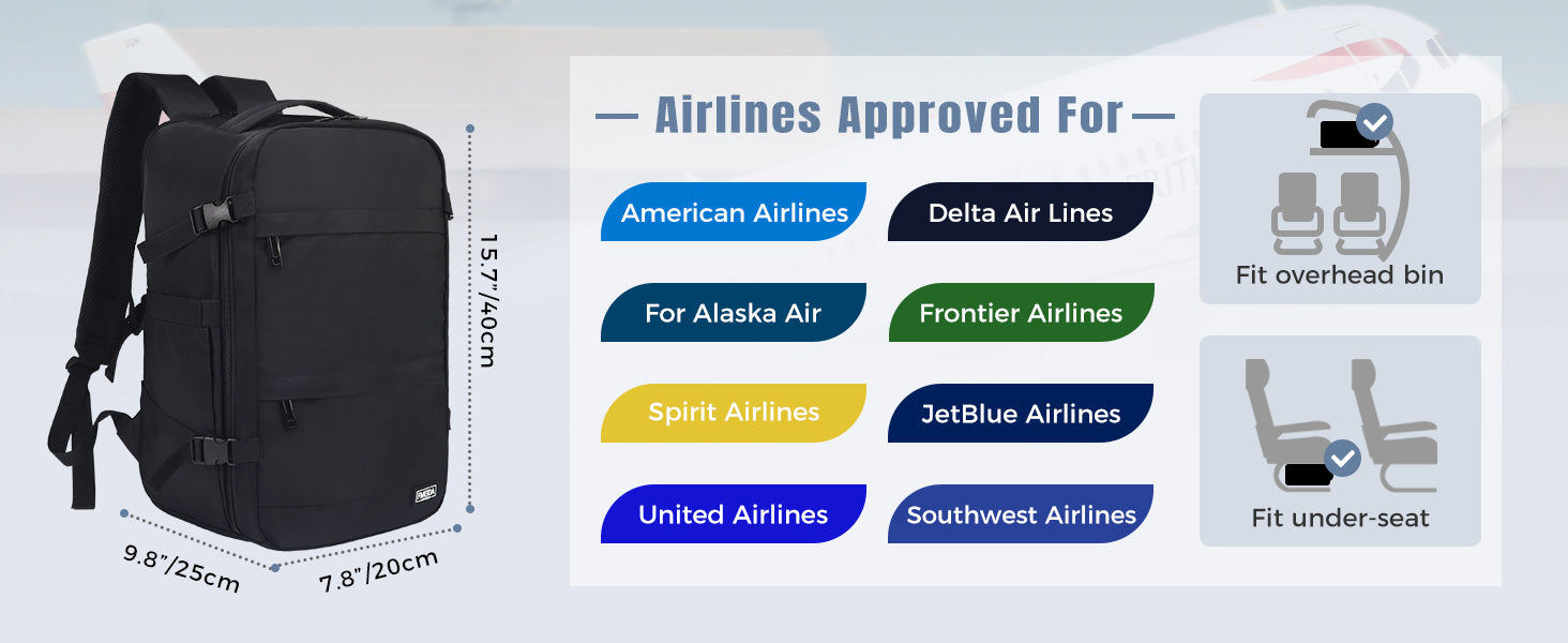 - Flight-Approved Personal Item for Ryanair & Airlines. The luggage backpack fit under seats on Ryanair, EasyJet & budget airlines with strict 15.7"*7.87"*9.84"(40x20x25cm) dimensions (adjustable side buckles compress thickness). Avoid carry-on fees while maximizing space as your airplane-approved personal item backpack