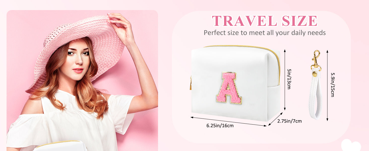 - Spot Your Style: Flaunt your initial with our preppy makeup bag; featuring a bold, gold-glitter chenille patch meticulously sewn onto high-quality fabric; more than just cute, it’s a premium accessory designed to stand out