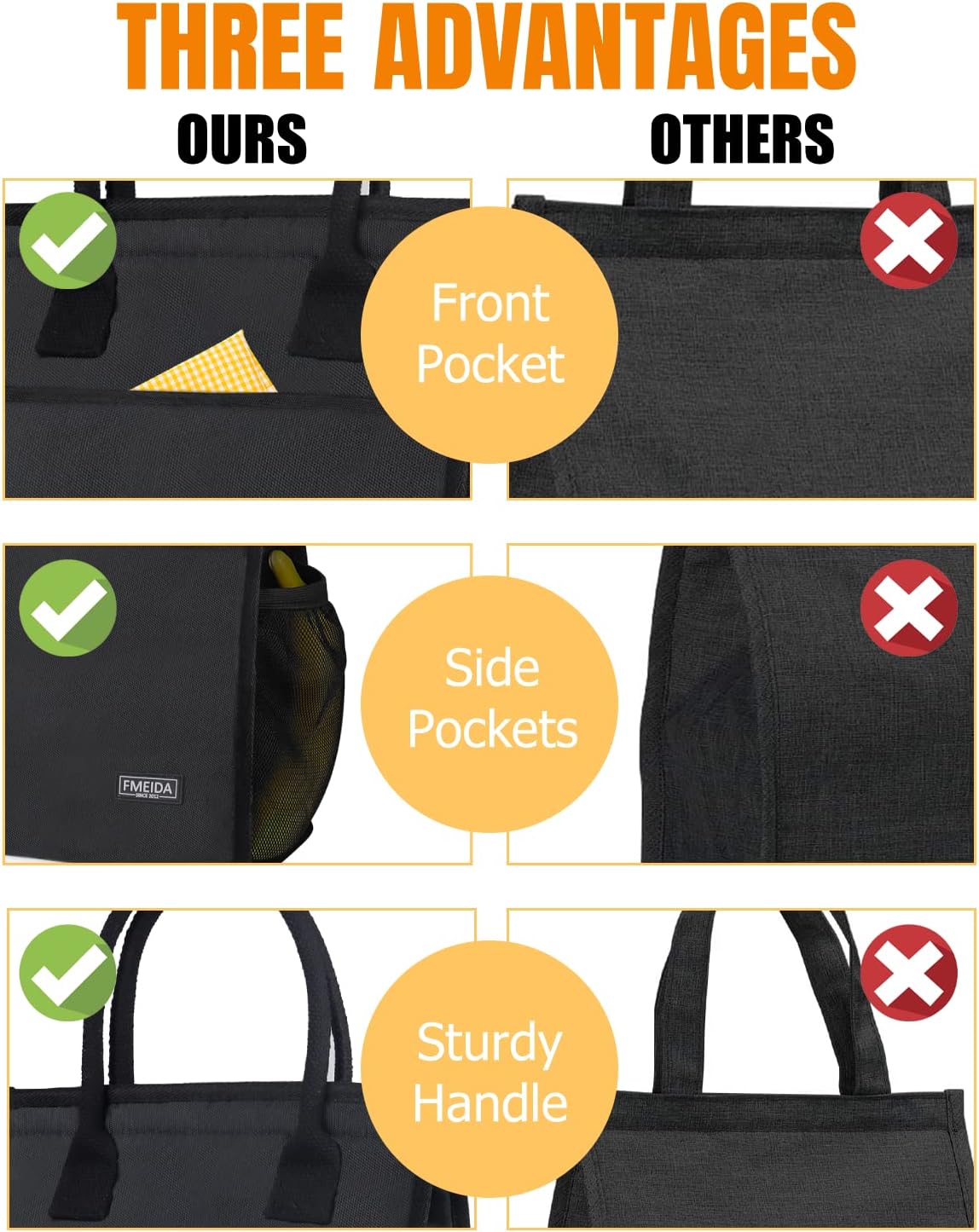 We understand the importance of having all your essentials within reach. That's why we've added a front pocket to our lunch tote bags, making it easier for you to grab what you need without having to open the main compartment. No more fumbling around or digging through your bag to find what you need, everything is just a quick reach away.