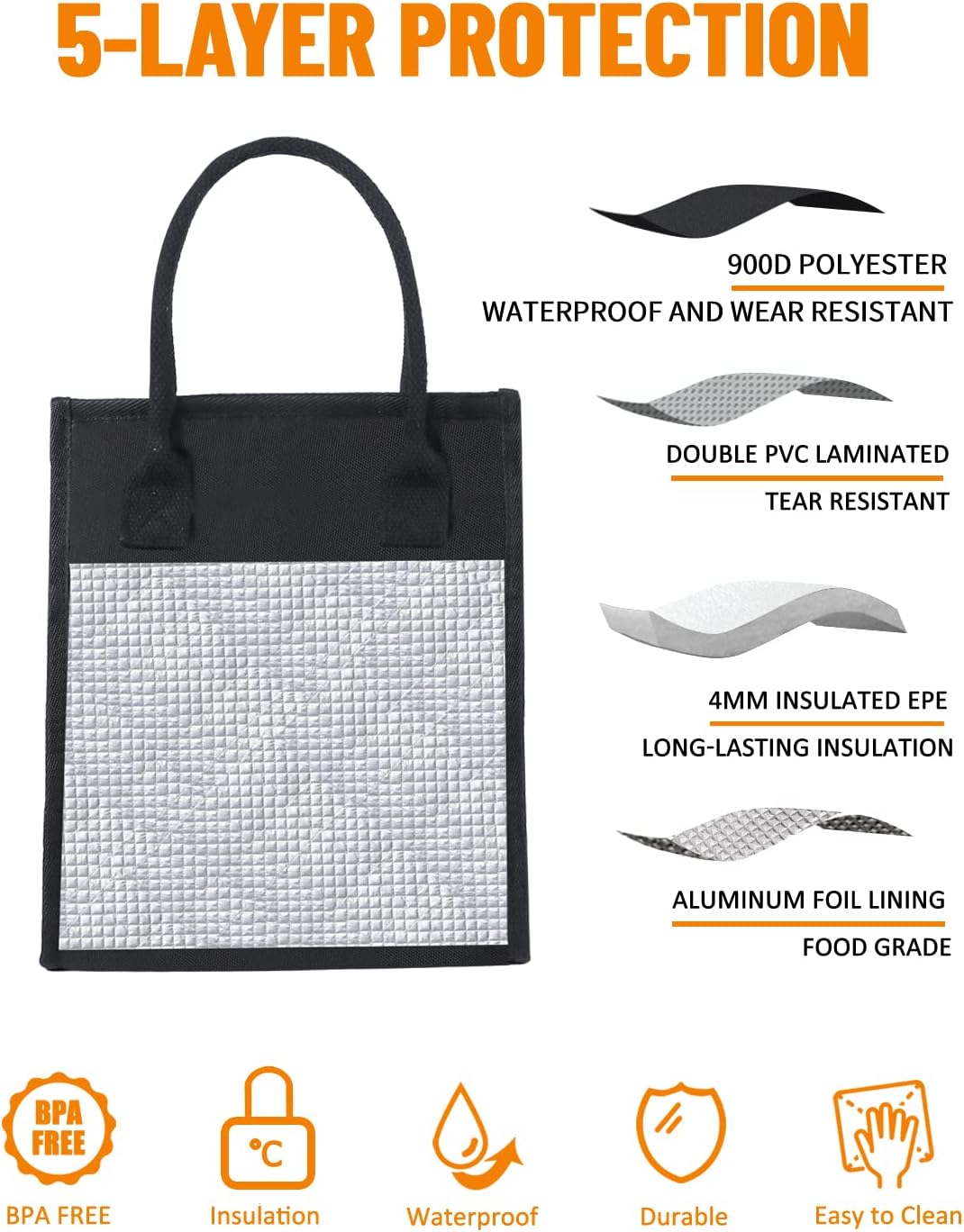 The exterior of the lunch bag is crafted from durable, water-resistant fabric that effectively shields its contents from the elements. The interior features a layer of 4mm EPE cotton, providing efficient insulation to maintain the temperature of your food. Whether you're carrying warm meals or chilled beverages, this lunch bag will keep your food at the optimal temperature for an extended period of time.